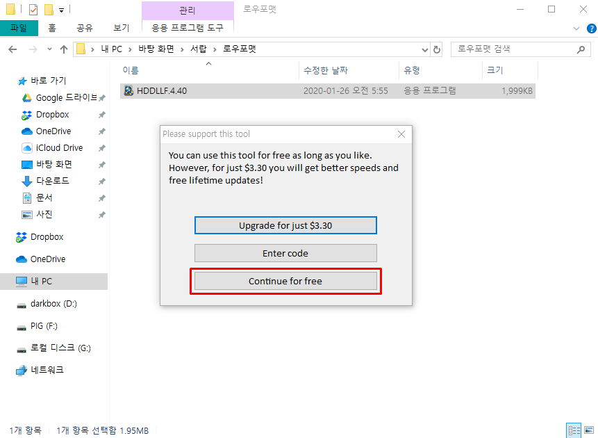 나는 무설치 버전을 다운 받아서 사용했다. 파일을 다운 받아서 더블클릭하면 아래와 같은 화면이 뜨는데 빨간 박스에 있는 무료 버전을 선택하면 되다. 무료 버전은 50MB/s로 속도 제한이 되니까 만약 빠르게 포맷을 하고 싶다면 3.3달러를 주고 유료 버전을 구입하면 된다.
