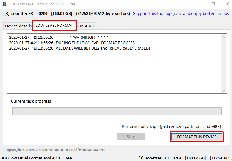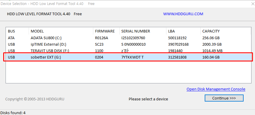 컴퓨터에 연결되어 있는 모든 하드 드라이브가 뜨는데 이 때 내가 포맷할 드라이브를 잘 선택하는 것이 중요하다. 이름을 보면 헷갈릴 수 있으니 C, D, G 같은 문자 경로로 파악하면 된다. 로우포맷은 절대 파일이 복구가 되지 않으니 포맷 전 꼼꼼하게 체크하는 것이 좋다. 하드를 선택하고 'Continue' 버튼을 누르면 다음 화면으로 넘어가는데 'LOW-LEVEL FORMAT'을 클릭한 다음 'FORMAT THIS DEVICE'를 클릭하면 된다.