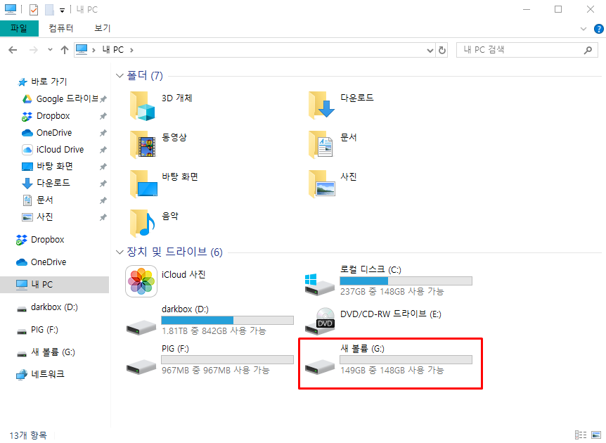 이 때부터는 설정할 것이 없고 그냥 '다음' 버튼만 계속 누르면 된다. 모든 설정이 완료되면 로우 포맷 후 처음에는 보이지 않았던 하드가 문자 경로와 함께 생성된 것을 볼 수 있다. 로우 포맷을 해서 그런지 하드인식도 체감 속도가 훨씬 더 빨라졌다.