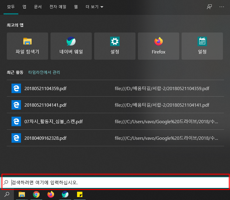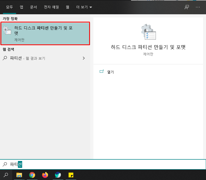 로우포맷을 하면 출고 상태와 동일해지기 때문에 컴퓨터에 인식이 되지 않아 바로 쓸 수 없고 파티션 설정을 해주어야 한다. 왼쪽 아래에 있는 돋보기 모양의 버튼을 클릭하면 검색창이 나오는데 검색창에 '파티션'을 검색하면 제어판의 파티션 설정창으로 넘어갈 수 있다. 제어판 기능을 잘 아는 분이 있다면 이 부분에서 검색창을 활용하지 않고 바로 제어판으로 가서 선택해도 된다.
