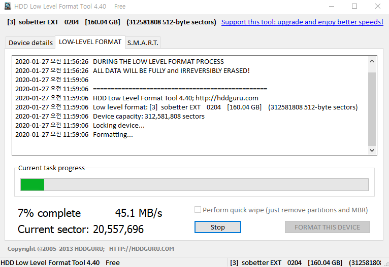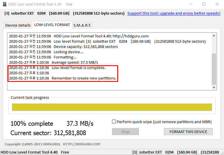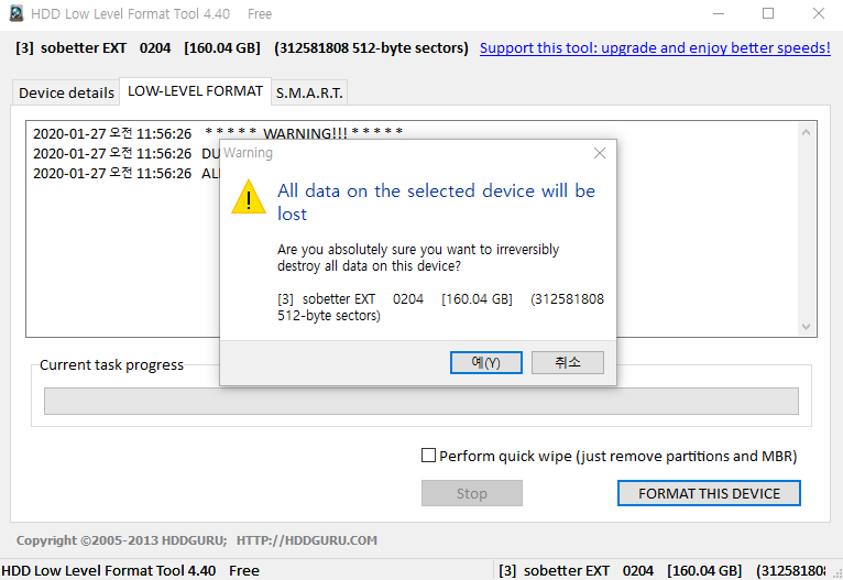 로우 포맷은 데이터 복구가 불가능하기 때문에 마지막으로 정말 포맷을 진행할 것인지 한 번 더 물어본다. '예'를 누르면 초록바가 생성이 되면서 포맷을 시작한다. 100기가 기준으로 40-50분 정도 소요된다고 보면 되니까 포맷을 진행한 후 한 숨 자고 오면 된다. 이 때 컴퓨터가 작업 중간에 절전 모드로 넘어가지 않도록 절전모드로 넘어가는 기능을 해제하는 것이 좋다. 포맷이 완료되면 초록바가 노란바로 되면서 완료 메시지가 뜬다.