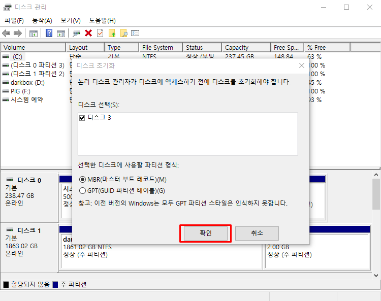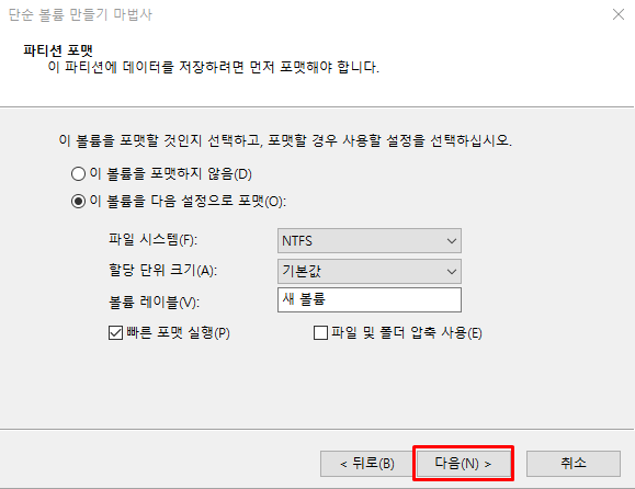 설정창으로 넘어가면 파티션 형식을 선택하라는 화면이 뜨는데 이 때 확인을 누른다. 그 다음 '할당되지 않음'이라고 뜬 하드를 찾아 마우스 오른 버튼을 누르고 새볼륨 만들기 버튼을 누른다.