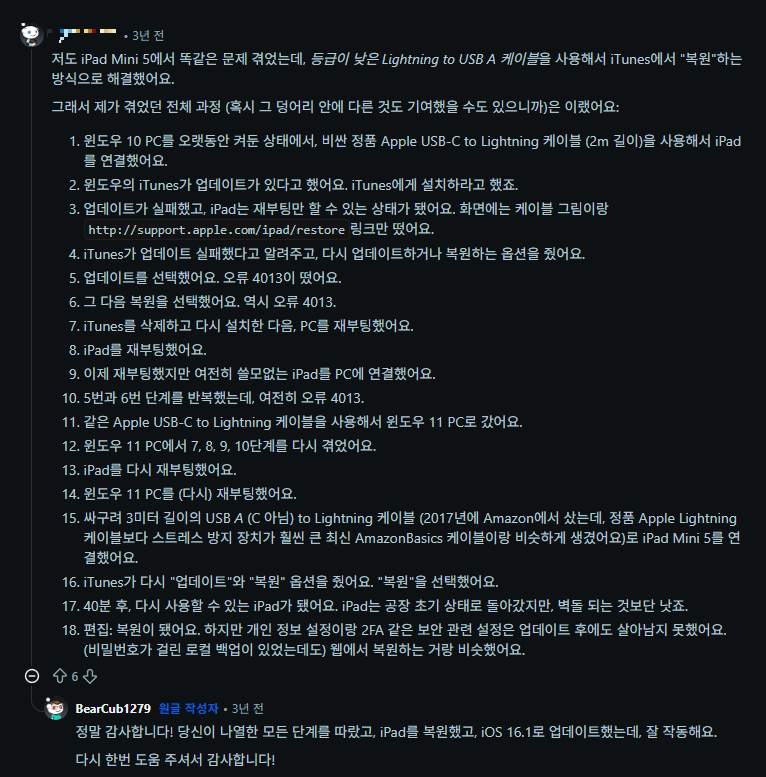 또다시 아이패드 업데이트 오류 관련 폭풍 검색을 통해 관련 정보를 찾았다. 주로 해외 유저들이 비슷한 오류를 겪는 경우가 많았다. 국내 사용자들은 이렇게 오래된 제품을 잘 사용하지 않는지 국내 사이트에는 정보를 찾기 어려웠다.