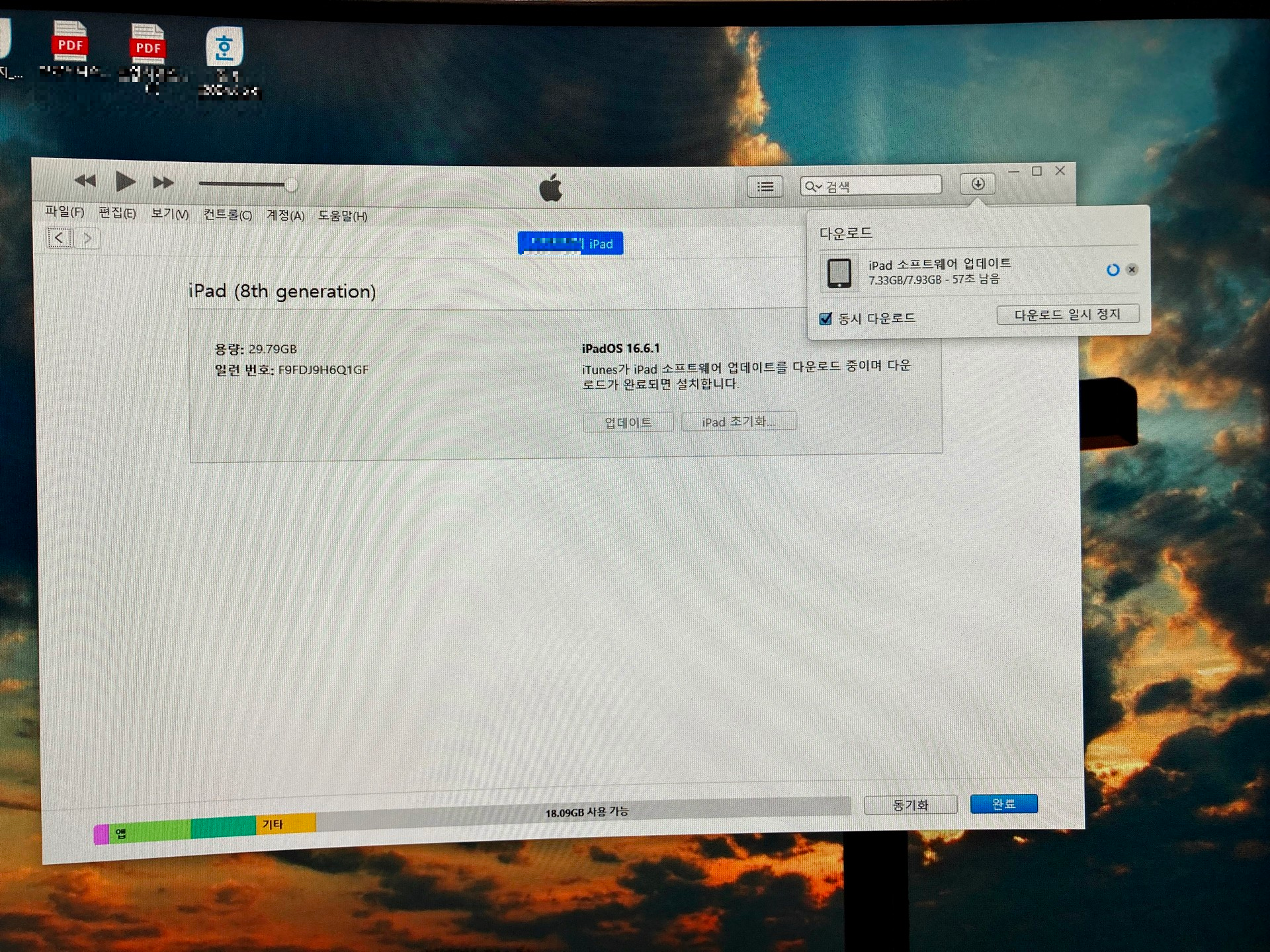 설마 이게 될까 싶었지만 밑져야 본전이라고 먼저 윈도우 아이튠즈에 연결해서 복원을 시도했다. 또다시 오류가 나길래 안 되겠구나 싶었는데 혹시 몰라 한 번 더 시도하니 업데이트 성공 메시지가 뜨면서 아이패드 복원과 함께 iOS26 업데이트까지 완료가 되었다.