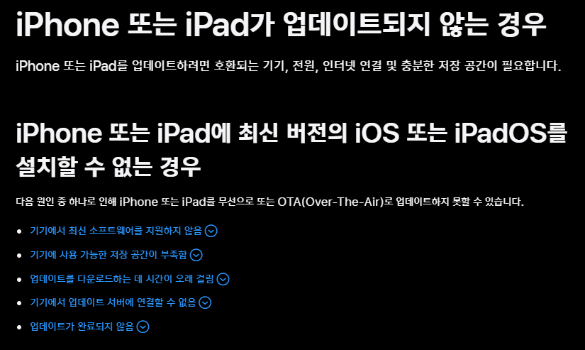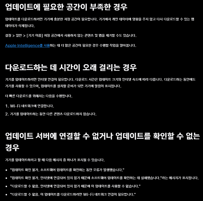 결국 기기를 초기화한뒤 모든 앱과 데이터를 지웠다. 이제는 당연히 될 것이라고 생각했지만 여전히 용량이 부족한지 업데이트 과정에서 오류가 발생해 더 이상 진행되지 않았다. 애플 공식 지원 문서의 글들도 확인해 봤지만 큰 도움이 되지는 않았다.