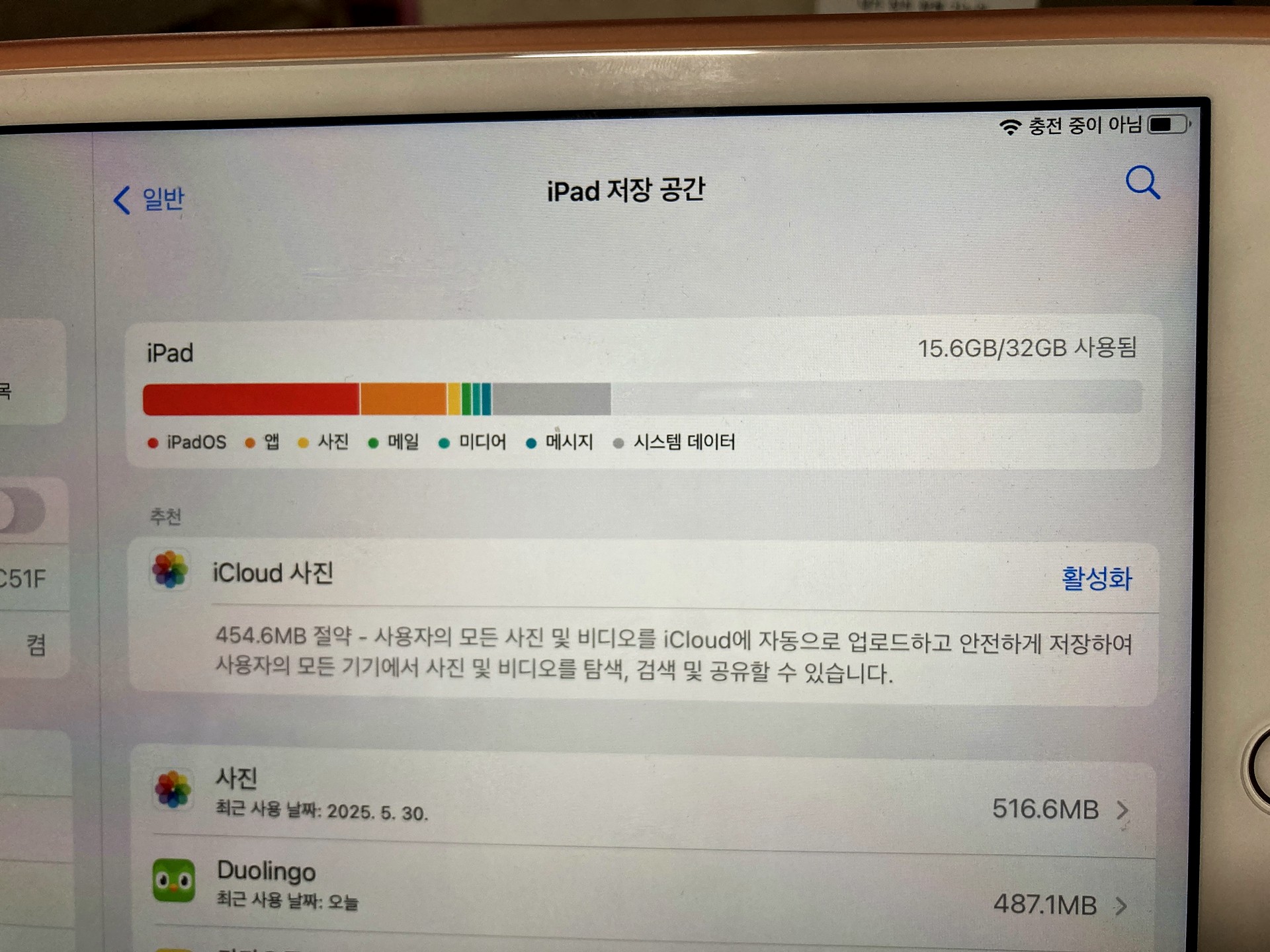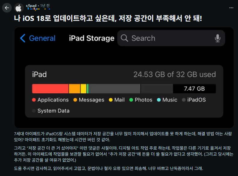 얼마 전부터 잘 사용하던 아이패드(8세대/32기가)가 앱을 튕기기 시작했다. 유튜브를 보다가 갑자기 꺼지기도 하고 카카오톡이나 네이버밴드도 아이콘을 터치하면 열리다가 튕기는 현상이 반복되었다. 일부 앱(듀오링고)은 아이콘 디자인이 뭉개지는 현상이 발생하기도 했다.