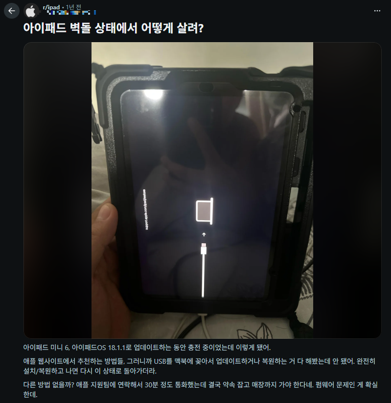 Reddit의 ipad 커뮤니티: 아이패드 벽돌 상태에서 어떻게 살려?