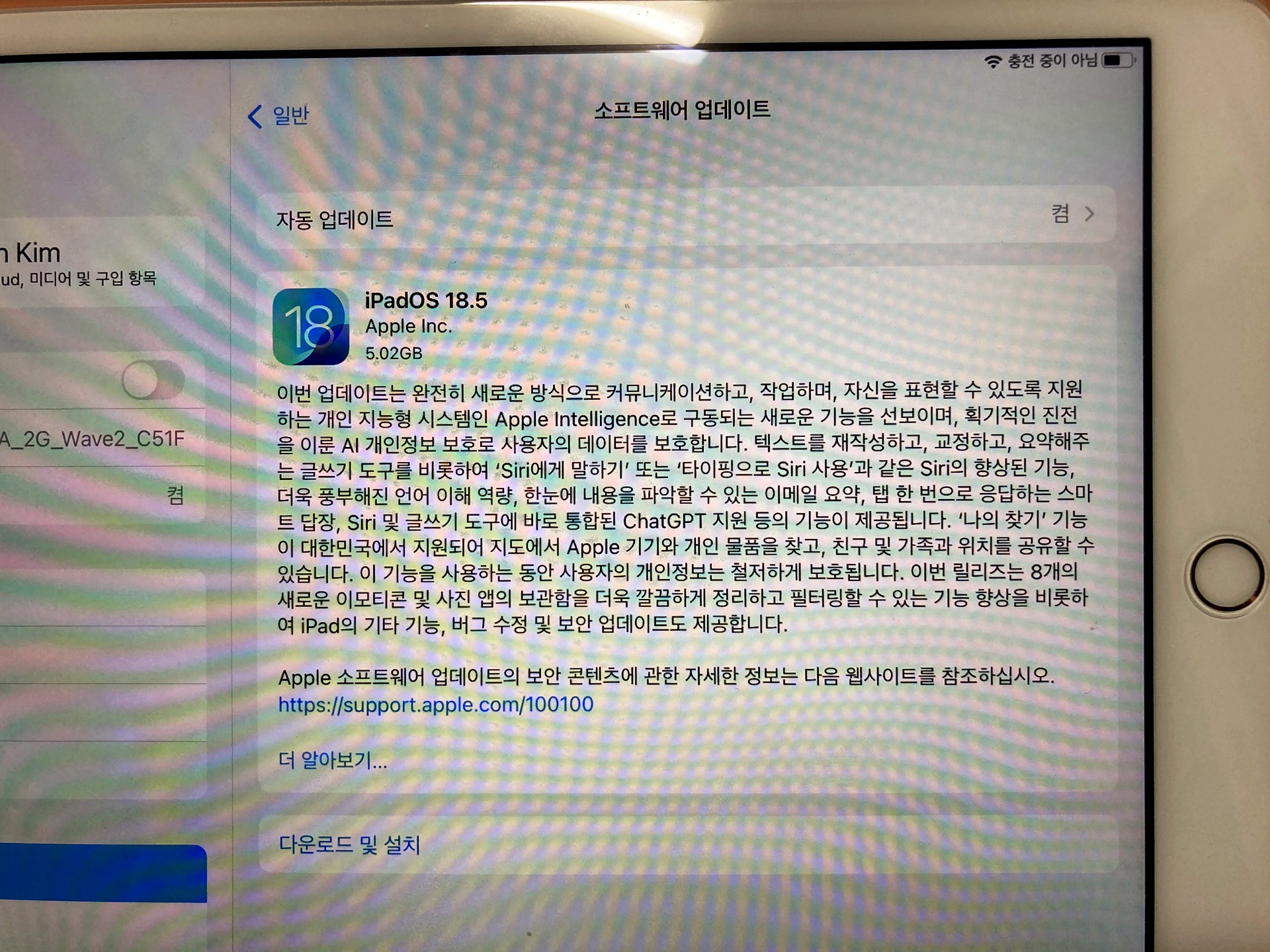 일반 설정에서 소프트웨어 업데이트 탭으로 들어가니 iPadOS18 또는 iPadOS26 둘 중 하나로 업데이트하라는 화면이 떴다. 순차적으로 업데이트를 하는 것이 좋을 것 같아 18 버전을 먼저 올리려고 했으나 실패했다. 재부팅 후 26 버전을 올리려고 해도 여전히 업데이트에 실패했다.