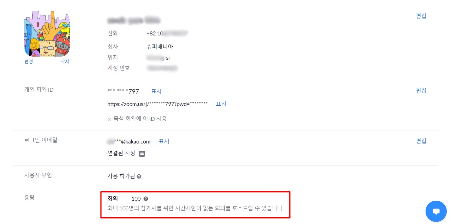 내 계정 정보를 보니 용량에 40분 제한 표기가 사라지고 '최대 100명 참가자를 위한 시간 제한이 없는 회의를 호스트할 수 있습니다'라는 문구로 변경되었다.