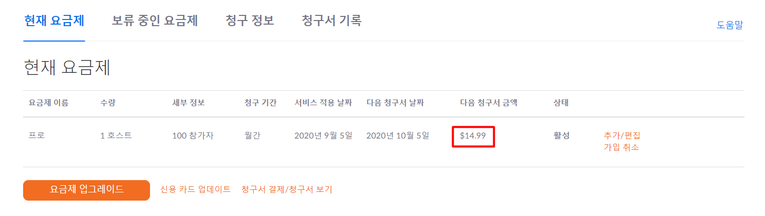 나처럼 3~4시간 동안 매주 줌으로 수업을 해야 한다면 유료 결제는 필수다. 비용 기준은 참여자가 아닌 호스트 기준이다. 참여자로만 줌을 사용할 예정이라면 긴 시간을 사용해도 비용이 발생하지 않는다. 즉, 유료 결제를 할 필요가 없다.