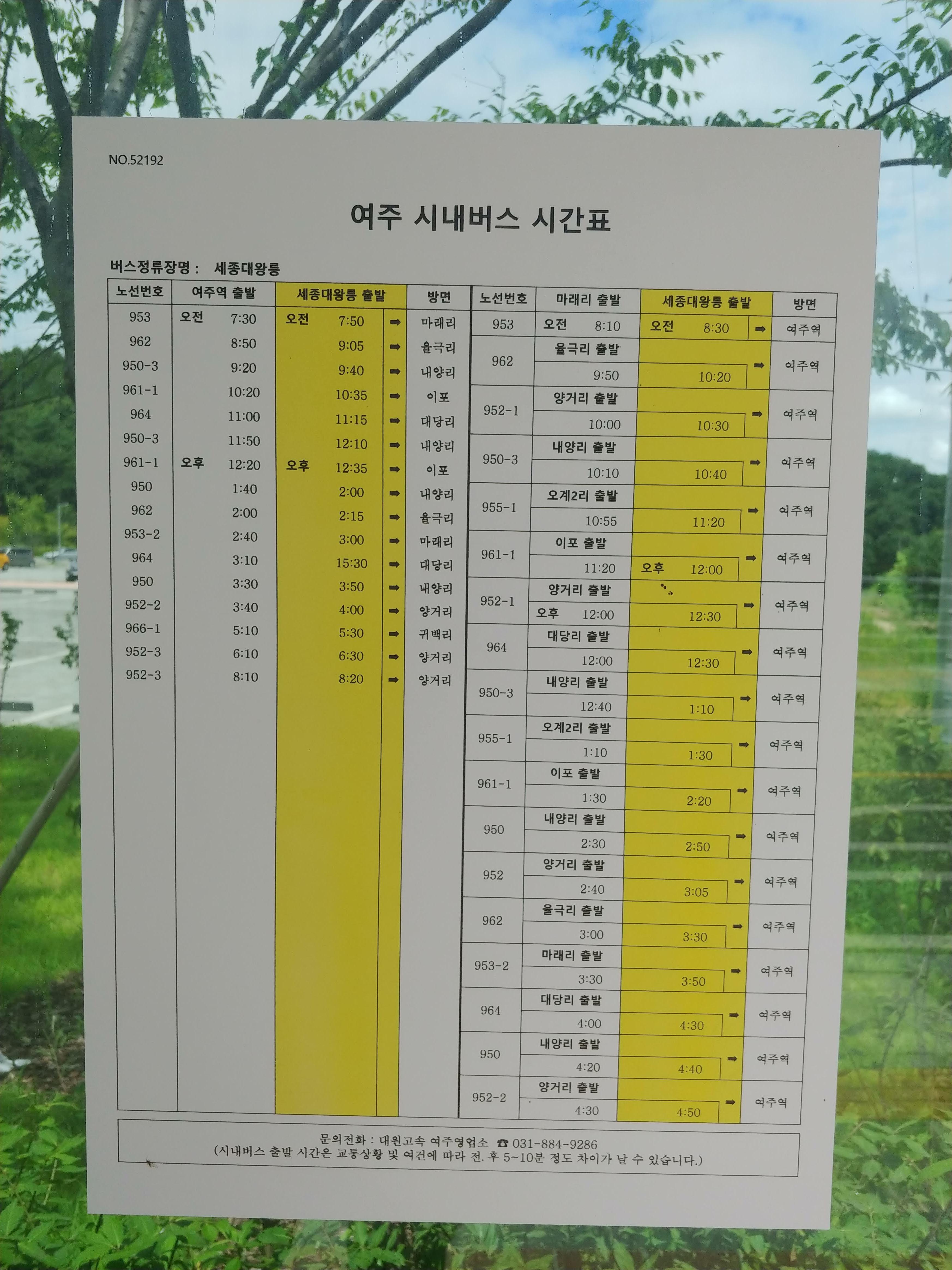 새로 생긴 경강선의 세종대왕릉역에 내리면 왕릉으로 가는 버스나 택시를 탈 수 있다. 하지만 배차 간격이 길고 택시도 많지 않기 때문에 오히려 여주까지 가서 대중교통을 이용하는 것이 좋을 수 있다. 나는 역에 내려서 버스를 타려고 했는데 생각보다 긴 배차 간격 때문에 택시 콜을 이용했고 요금은 대략 1만 원가량이 나왔다.