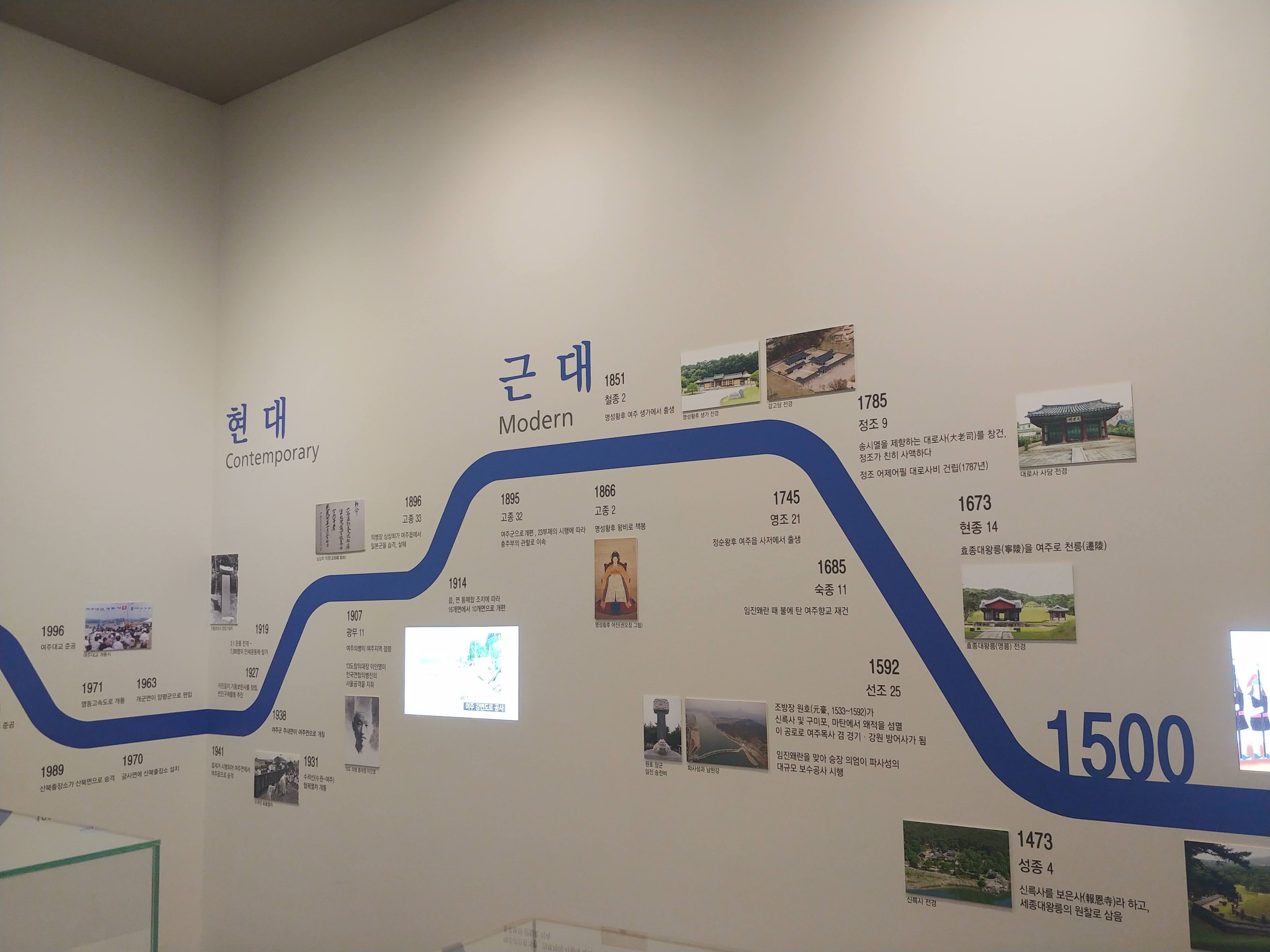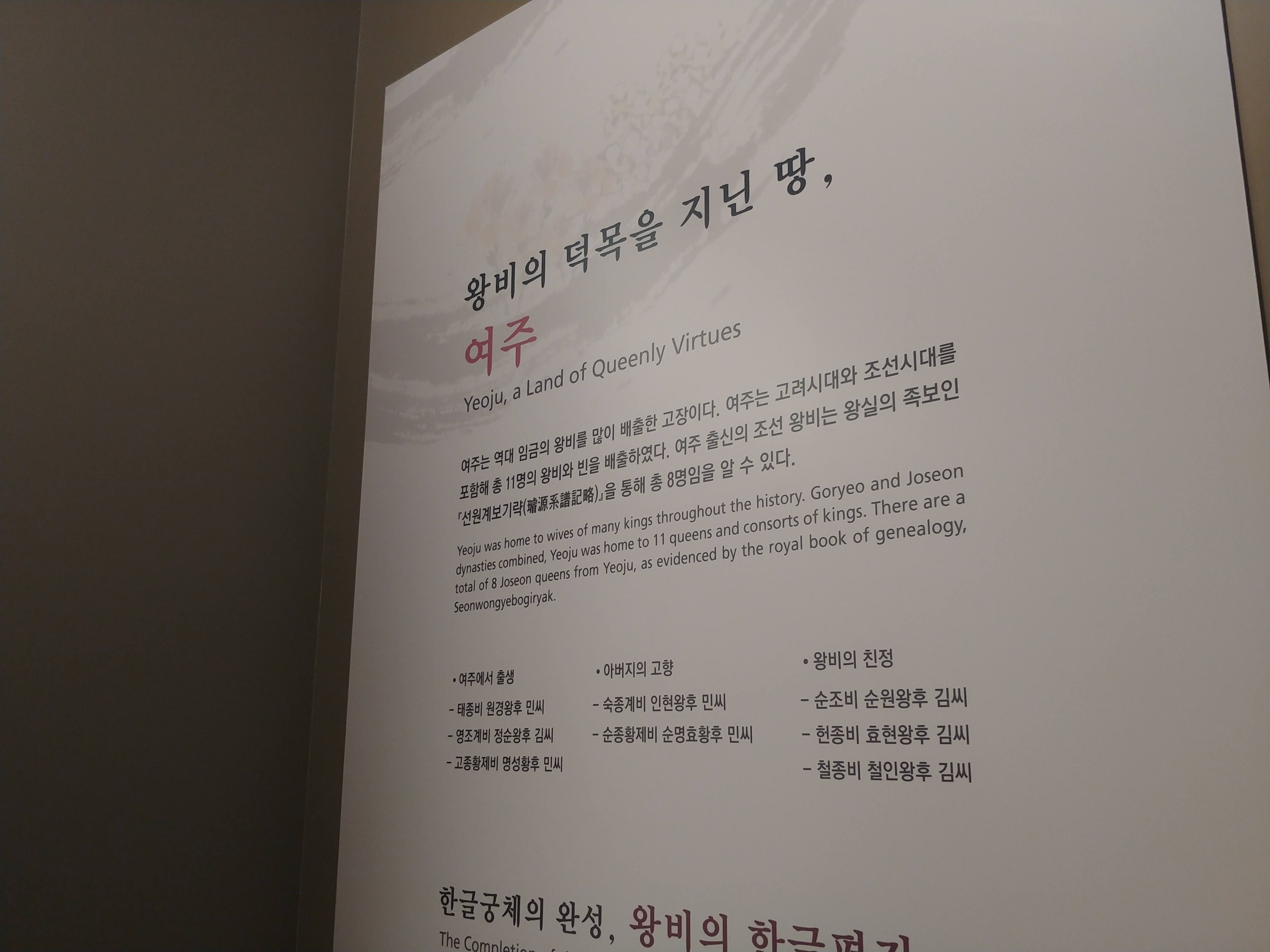 여주역사실에는 선사시대부터 현대까지 여주에 대한 기록이 자세하게 기록되어 있다. 전시실을 돌아보면서 여주에 박물관과 미술관이 많은 이유를 알 것 같았다. 여주는 외부 사람들에게 쌀과 도자기가 유명한 도시 정도로 알려져 있지만 문화 유적과 유산이 많은 도시이기도 하다. 예로부터 선비가 많고 가풍이 좋은 집안이 많아서 고려시대부터 조선시대까지 총 11명의 왕비와 빈을 배출했다.