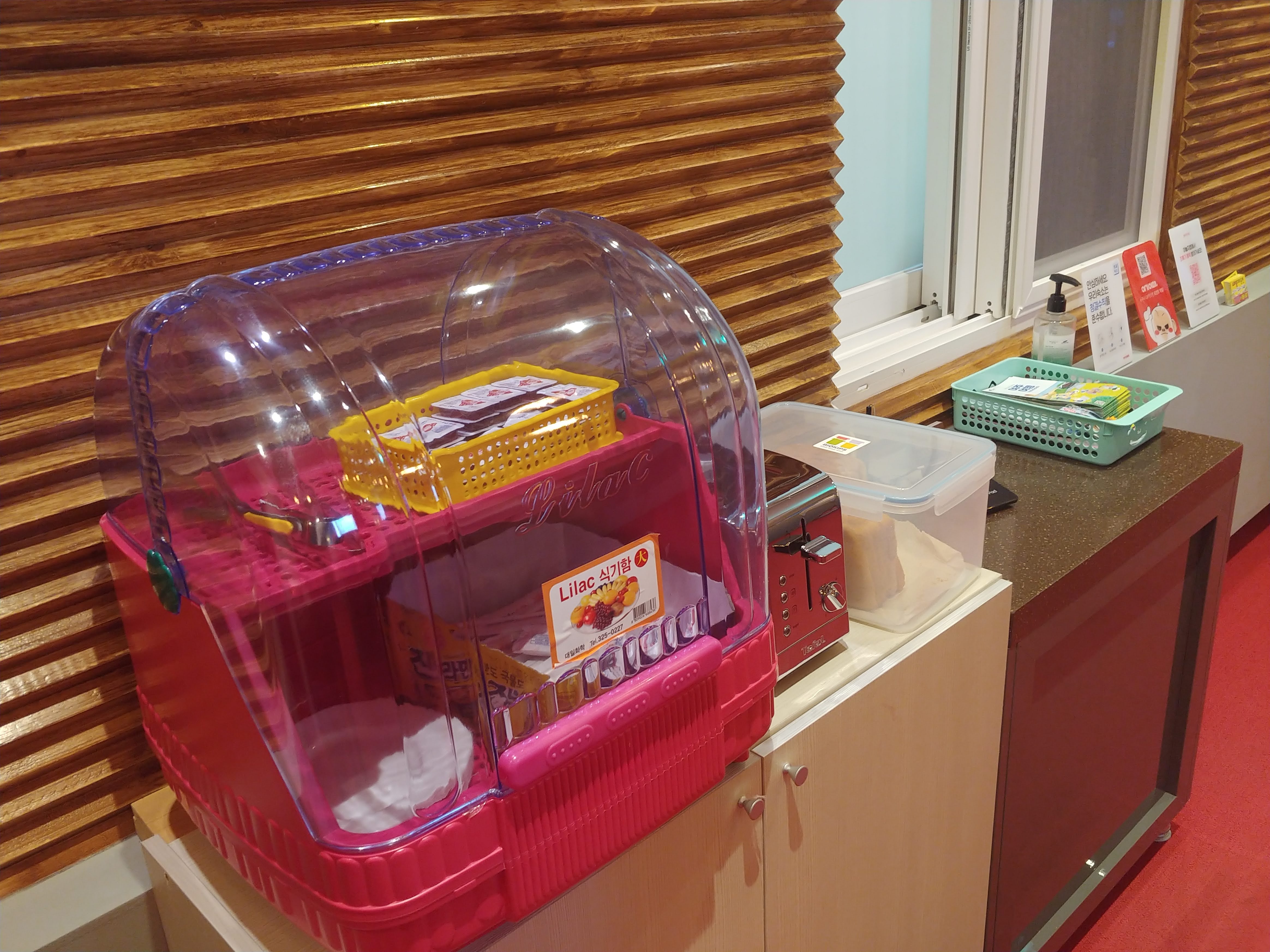 1층 복도 앞에 커피와 토스트가 마련되어 있고 자유롭게 이용 가능하다. 방 안에 컵라면이 준비되어 있어서 아침을 토스트와 함께 가볍게 해결할 수 있다.