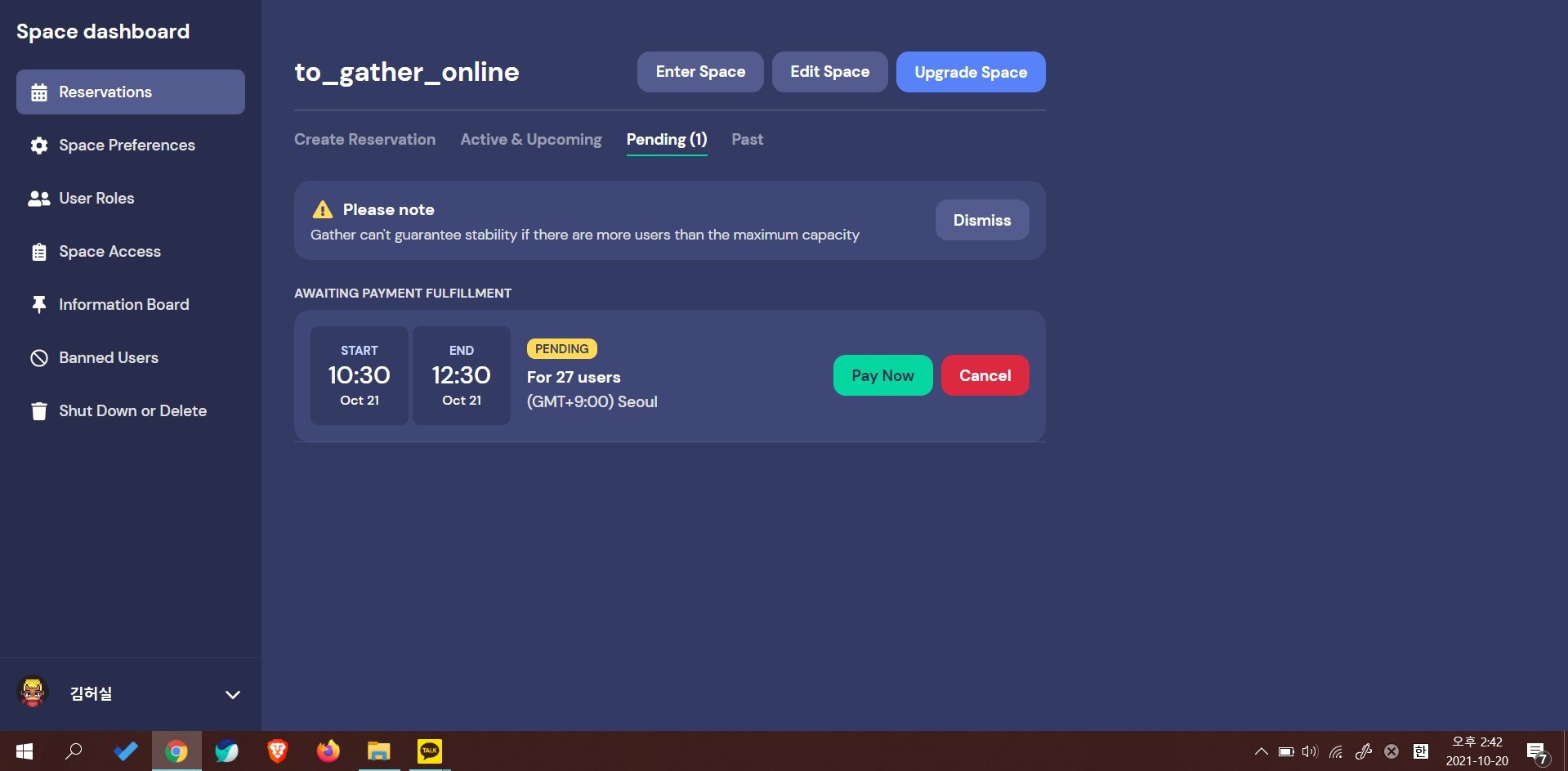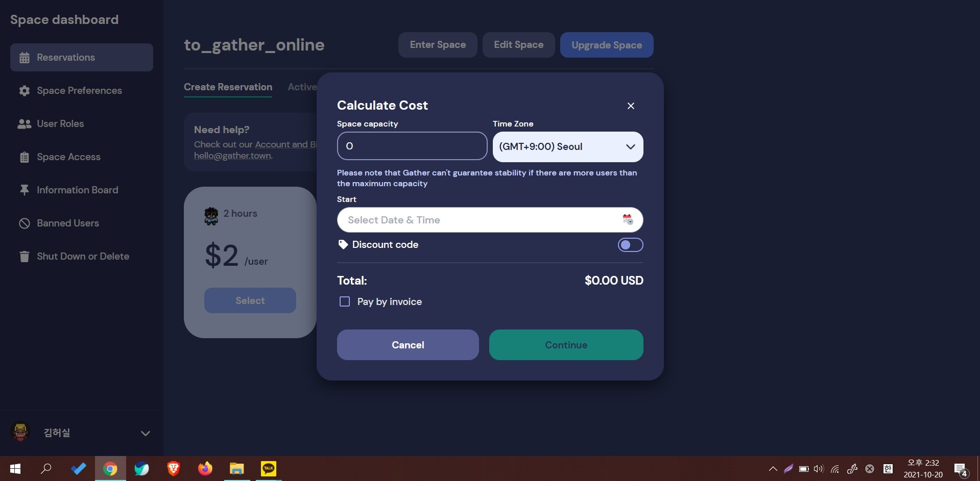 'capacity'에 예상 인원을 입력하고 'start'에 예상 운영 시간을 입력한다. 입력한 인원보다 접속 인원이 늘어날 경우 마이크와 카메라 기능의 안정성을 보장할 수 없기 때문에 인원을 미리 파악해주는 것이 좋다. 게더타운은 줌(ZOOM)에 비해 서비스 자체가 아직 불안정하다 보니 유료 결제 시 이 부분은 꼭 정확하게 입력하는 것을 추천한다.