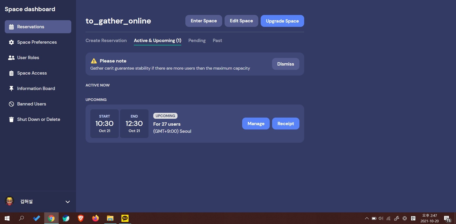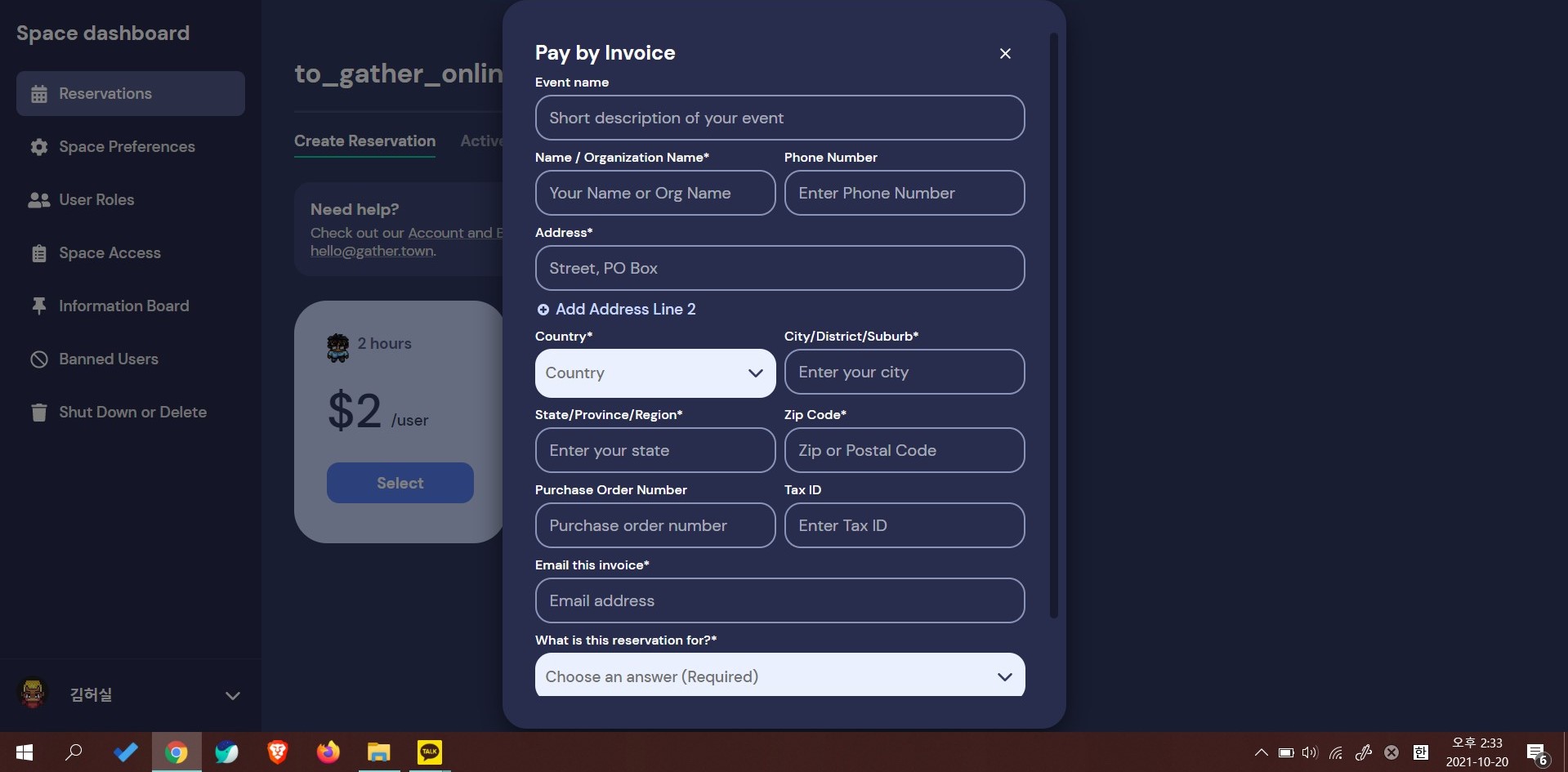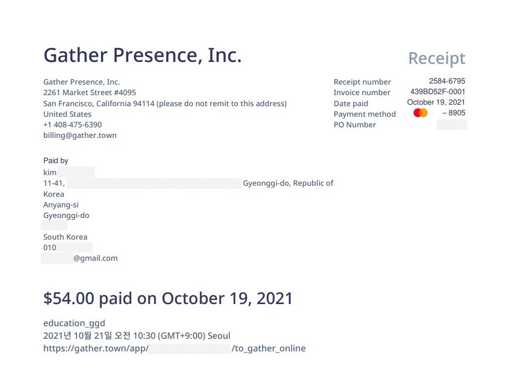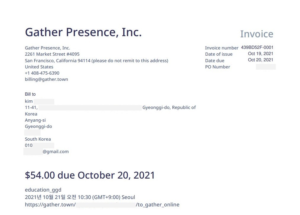 결제가 완료된 맵은 아래 화면처럼 맵이 유료 버전으로 활성화된다. 거래명세서와 영수증은 결제할 때 입력한 이메일로 바로 발송된다. 이제 게더타운에 들어올 사람들에게 링크를 공유하고 예약한 시간에 사용하면 된다. 결제 과정이 다소 복잡하게 느껴질 수 있지만 오프라인으로 공간을 대관할 때와 개념은 동일하다.