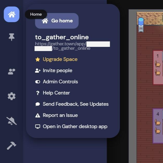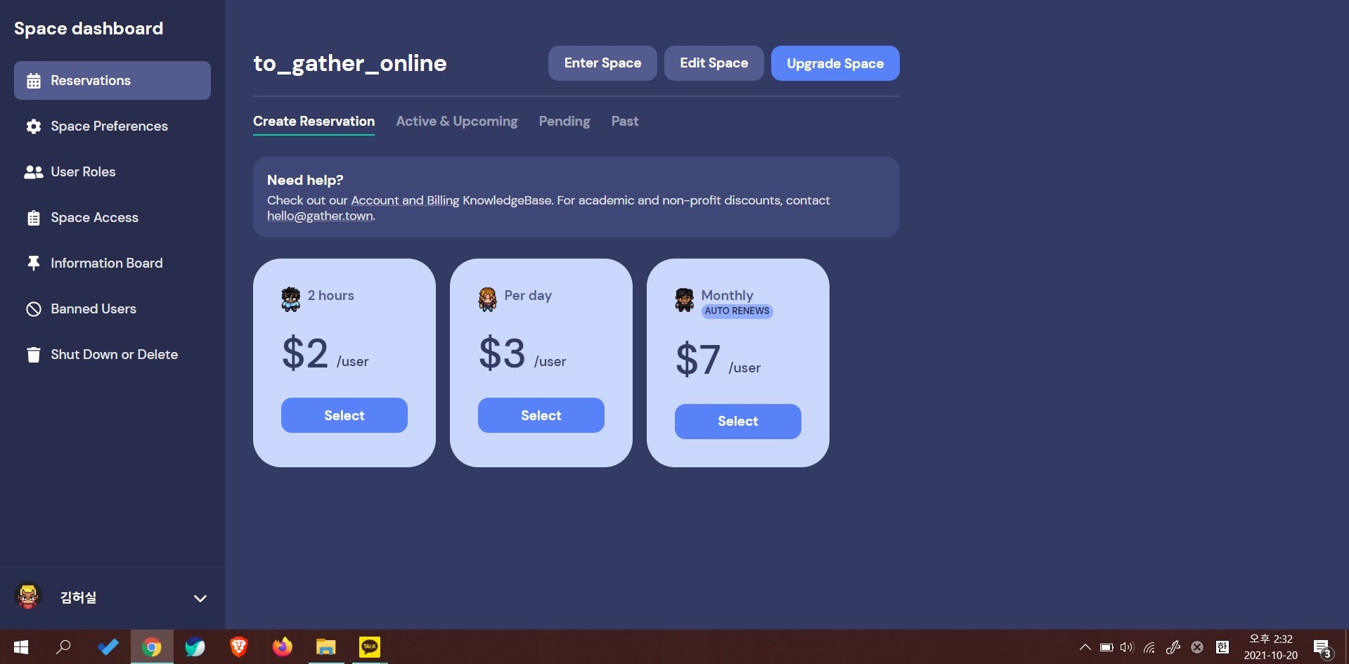 관리자 화면으로 들어가는 방법은 두 가지다. 내가 만들어 놓은 맵 리스트가 있는 화면에서 결제하고 싶은 맵의 오른쪽 하단 설정(점 3개)을 누른 후 'Manage Space'를 클릭하는 방법과 맵 안에서 왼쪽 상단 집 모양 아이콘을 클릭한 후 'Upgrade Space'를 누르면 된다.