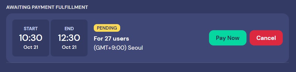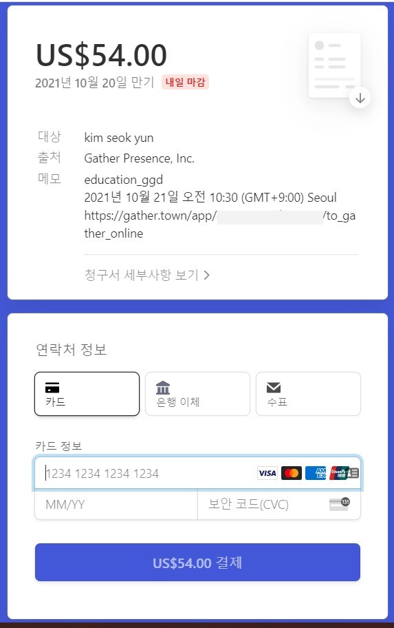 게더타운은 25명까지는 무료로 사용 가능하지만 26명이 되는 순간부터 모든 인원에 대한 비용을 유료로 결제해야 한다. 그런데 유료로 결제하는 부분이 처음 하는 사람에게는 다소 문턱이 높다. 어려운 영어는 아니지만 모든 문장이 영어로만 되어 있기도 하고 해외 결제가 처음인 분들은 당황할 수밖에 없다. 결제 과정을 간단하게 요약하면 다음과 같다.