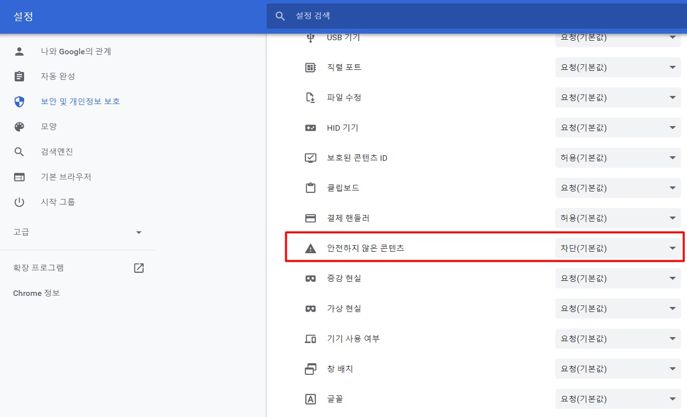 마우스 스크롤을 이용해 아래로 내려오면 '안전하지 않은 콘텐츠'라는 부분이 차단으로 되어 있을 것이다. 나 같은 경우 용량이 큰 파일만 다운로드 차단이 되었는데 이 부분은 정확한 기준은 잘 모르겠다.