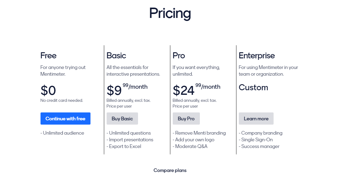 무료 버전을 이용해도 참여자 수 제한 없이 사용할 수 있는 점이 가장 좋다. 다만 질문의 양, 결과값을 엑셀로 뽑기, 멘티미터 브랜드 로고 제거 후 회사 로고 사용 등 추가 기능을 사용하고 싶다면 유료 버전을 이용해야 한다.