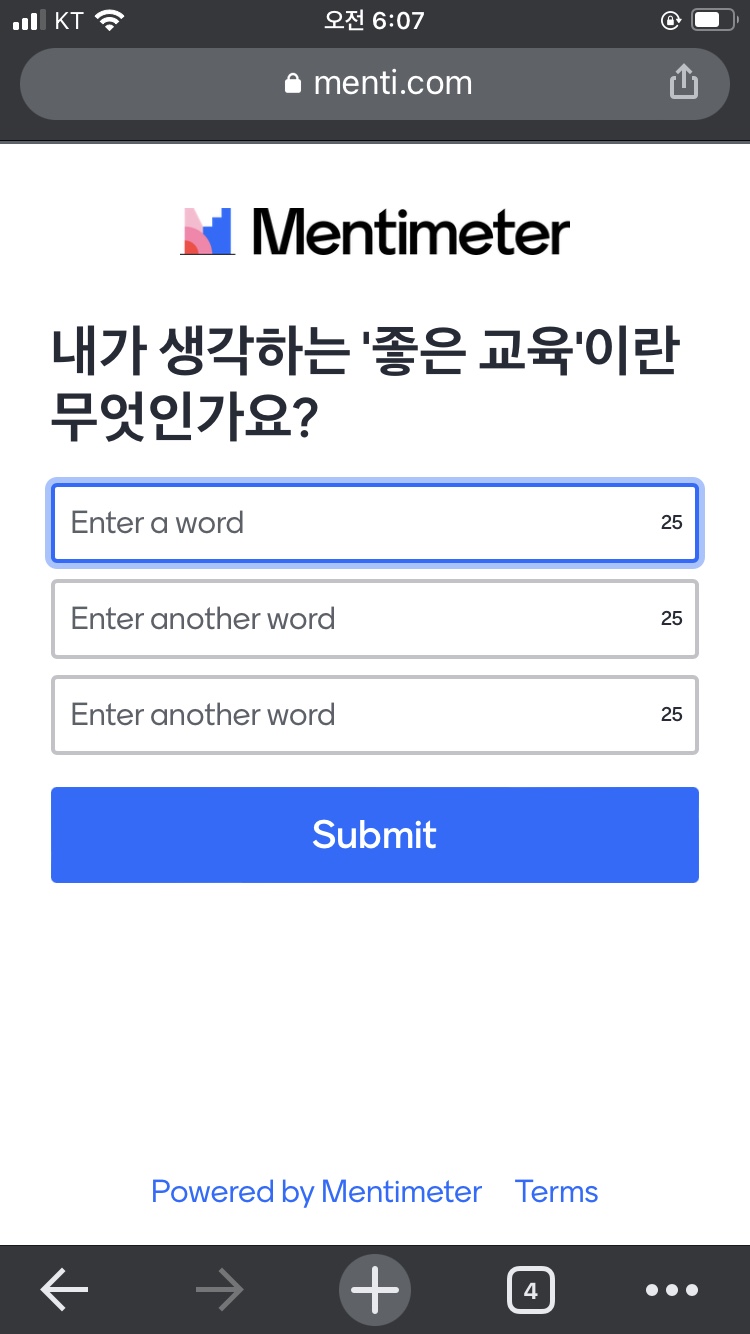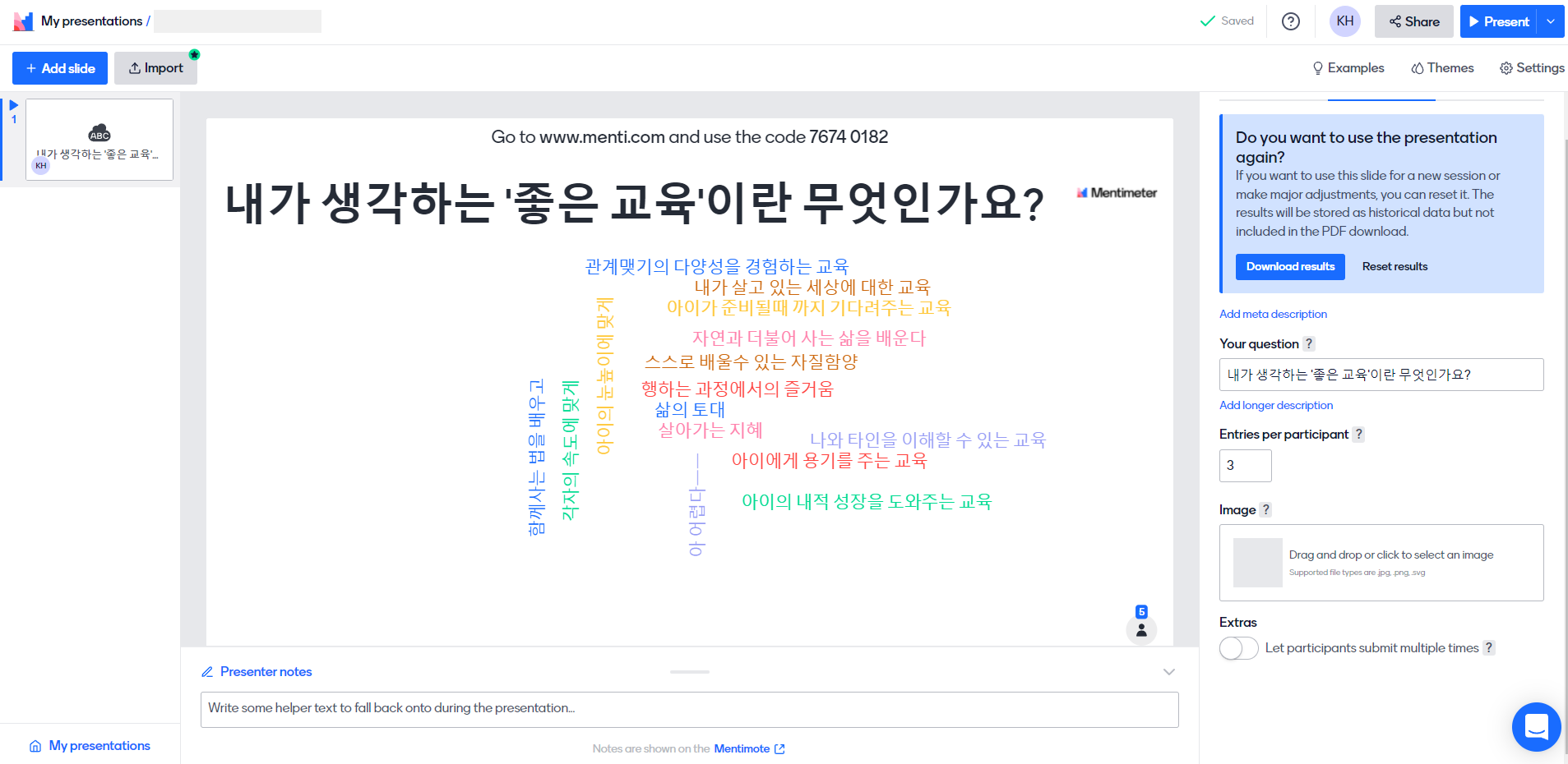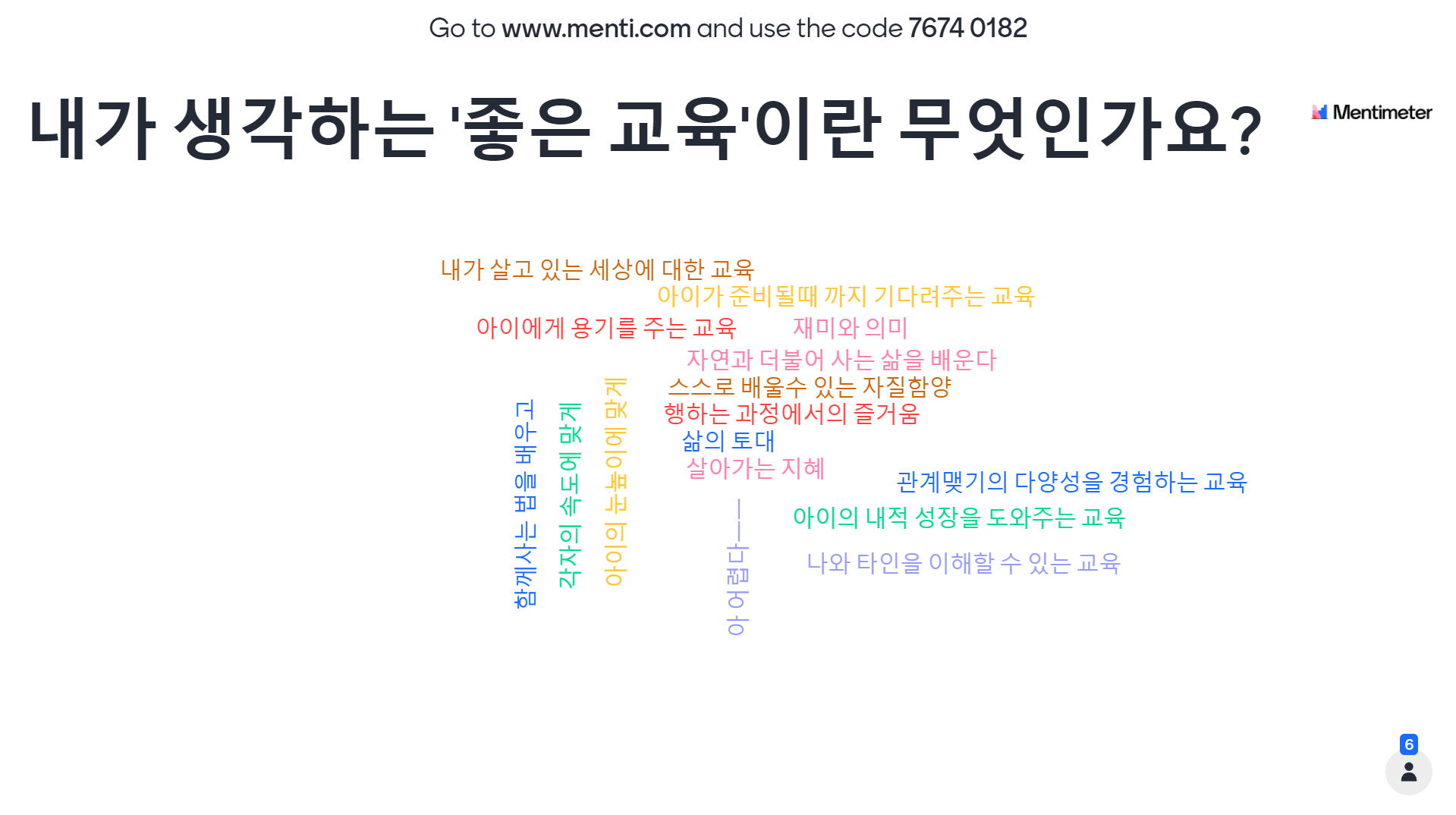 아래 화면은 작년에 교육 관련 지역 모임에 특강을 진행할 때 사용했던 화면 모습이다. 대략 20여 명 정도 규모의 작은 강의였고 처음 보는 사람들이 대부분이어서 멘티미터를 사용했다. 강의 시작 전 해당 질문을 전지고 자기 생각을 적어달라고 했고 강의가 끝날 무렵 각각의 답변들을 보면서 강의를 잘 마무리할 수 있었다.