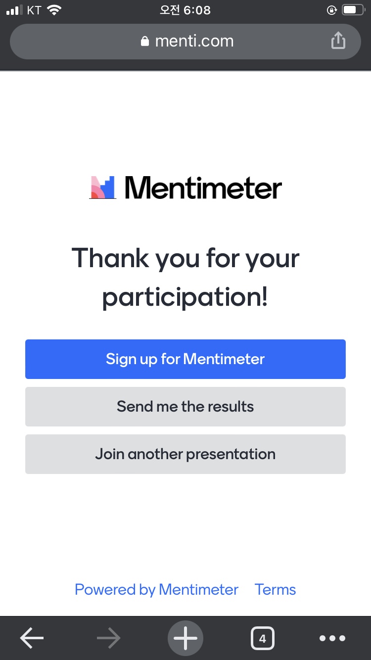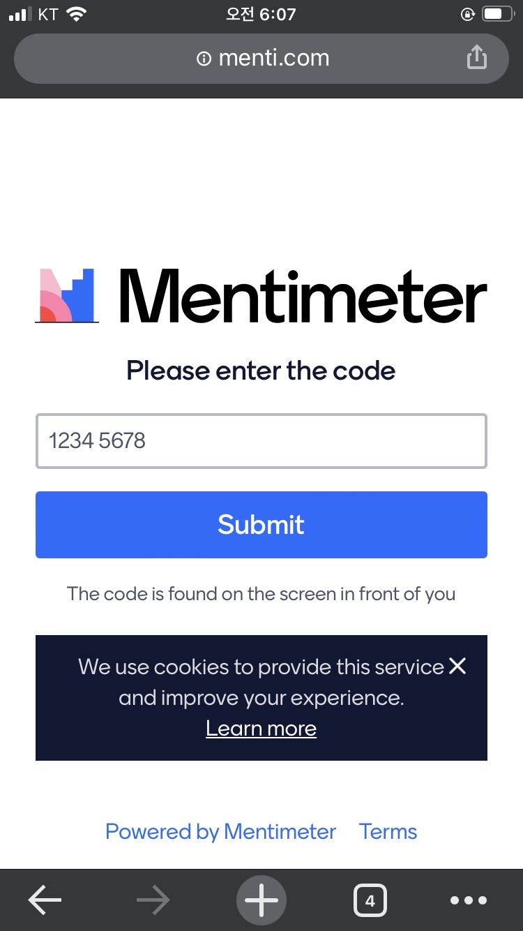 질문에 답하는 방식도 간편하다. 줌으로 수업할 경우 발표자가 'menti.com' 주소를 채팅창으로 보내주면 참여자는 해당 링크를 클릭하고 들어가서 전체 화면 상단에 나와 있는 8자리 코드를 입력하면 된다. 영어로 되어 있지만 사용자 화면이 직관적이기 때문에 사용하는데 어려움은 없다.