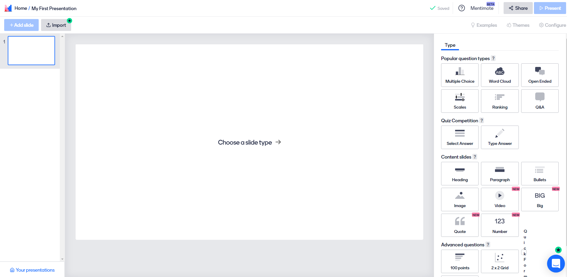 퀴즈 중심의 카훗과 달리 멘티미터는 슬라이드 구성을 다양하게 할 수 있는 게 장점이다. 파워포인트에 실시간 반응형 퀴즈와 질문 기능을 첨가한 웹 기반 프레젠테이션 도구로 보면 될 것 같다.