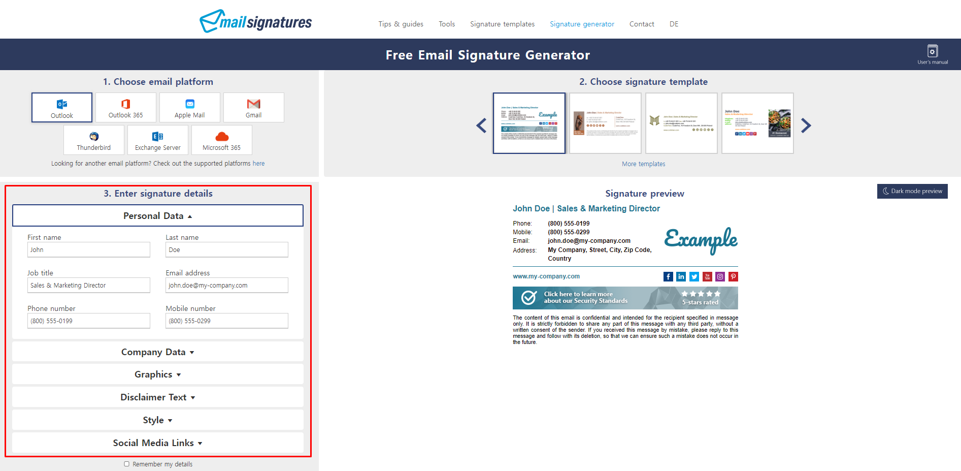 모든 내용을 입력하고 나면 왼쪽 하단 '4. Apply your signature'를 누르자. 여기서 중요한 것은 왼쪽 상단의 이메일 플랫폼을 Thunderbird, Exchange Server, Microsoft 365 셋 중 하나를 선택해 주어야 한다. 상단의 4가지 이메일 플랫폼을 선택할 경우 HTML을 추출할 수 없다.