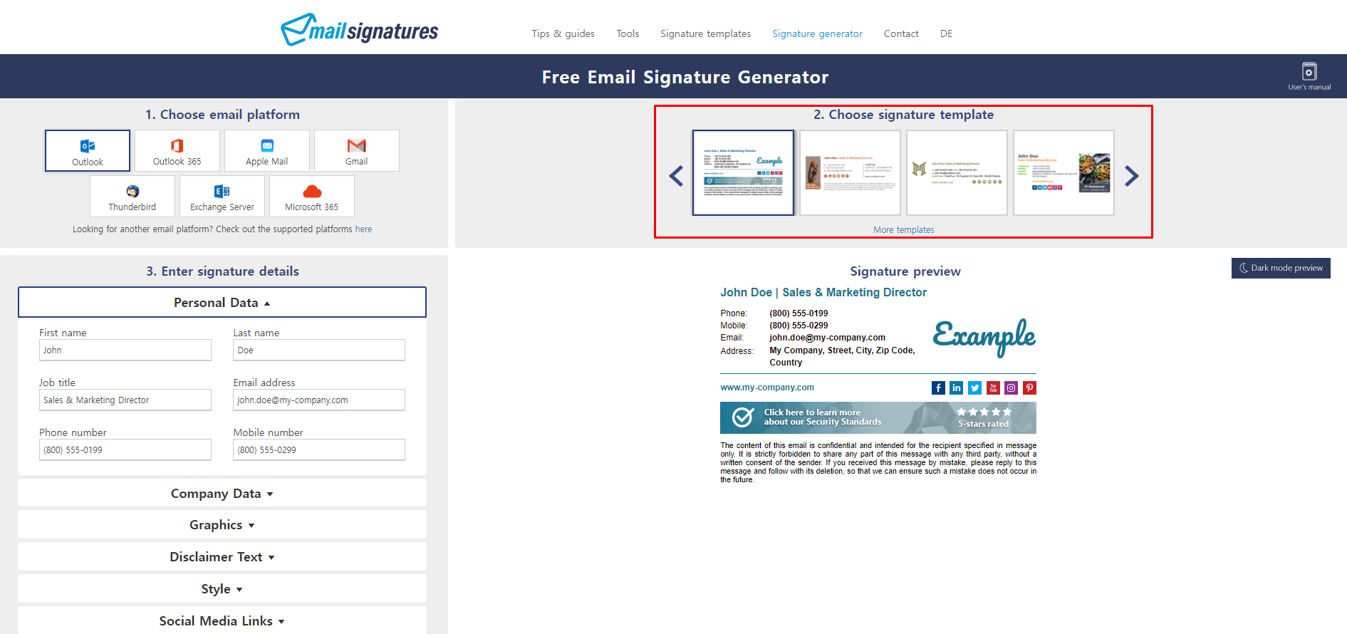 상단에 보면 '2.Choose signature template'라고 되어 있는 부분에 기본 탬플릿을 제공한다. 대략 40가지 정도를 고를 수 있는데 여기에 있는 게 마음에 들지 않으면 하단에 'More templates'를 선택하면 보다 많은 선택지가 나온다.