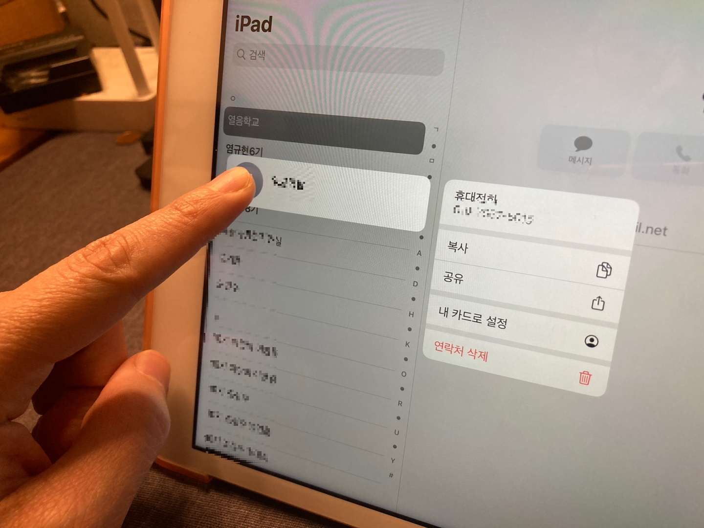 손가락 1개로 주소 하나를 길게 누르면 아래 화면처럼 나온다. 이렇게 하면 연락처 1개씩만 지울 수 있다. 지워야 할 연락처 개수가 많지 않고 선택적으로 지우고 싶다면 이 방법을 사용하면 된다.