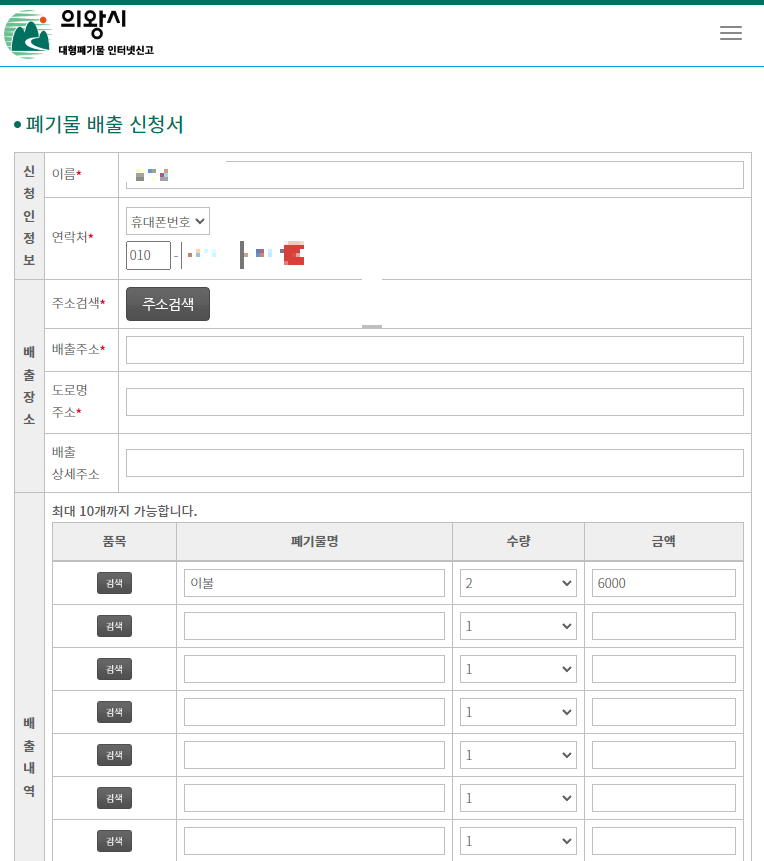내가 살고 있는 의왕시에서는 시청 페이지와 별도 모바일 전용 수거 신청 페이지도 운영하고 있다. 웹 기반이기 때문에 프로그램을 따로 설치하지 않아도 되는 점 때문에 자주 이용하고 있다. 주소와 전화번호, 쓰레기 품목, 개수 등을 입력하고 결제한 후 신청한 날짜에 집 앞 쓰레기 버리는 곳에 배출하면 된다.